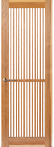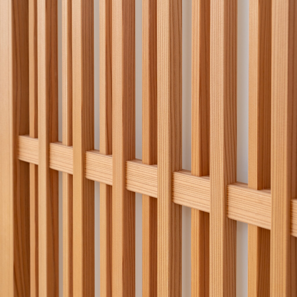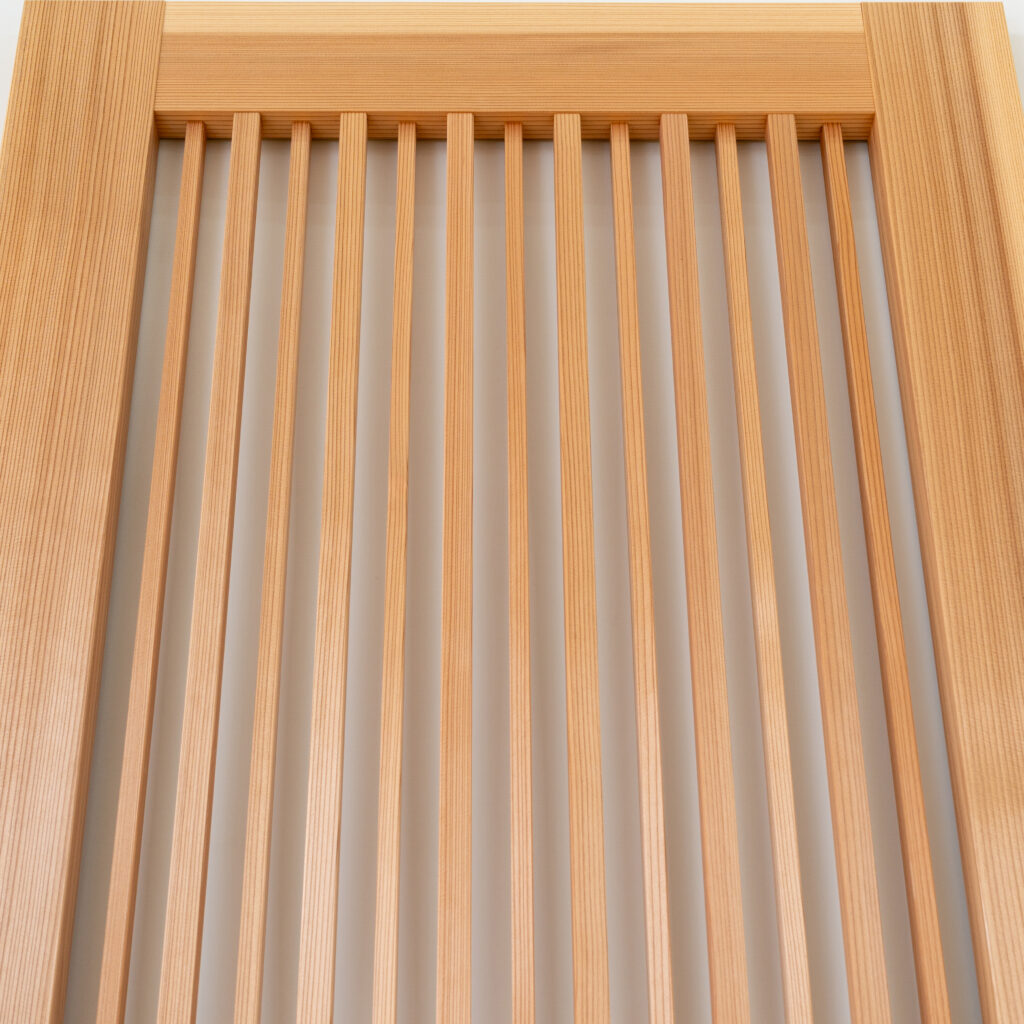 時間の移ろいと共に変化する光を楽しめる、杉の美しい縦格子ドア。